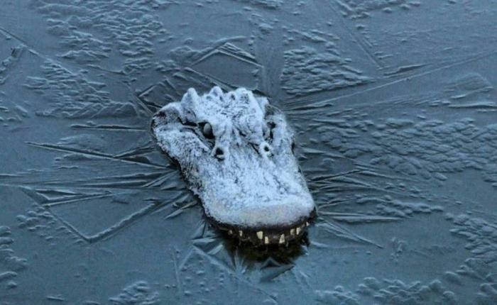 Аллигатор впал в оцепенение. Он не мёртв. Аллигаторы Северной Америки готовы к небольшим заморозком и просто вмерзают в лёд на пару недель. Эта оледеневшая морда спокойно дышит и полностью здорова, хоть и метаболизм сильно замедлен.