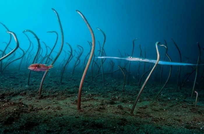 Сад угрей. Некоторые виды этих рыб не любят плавать и просто растут из своих норок на дне, вылавливая всякую мелочь. Они образуют целые леса на несколько квадратных километров. Уютно там у них.