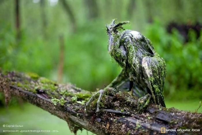 Это просто молодая цапля сильно испачкалась)))) Подрастающий птенец упал в болото во время шторма. Вот кто настоящий Леший!