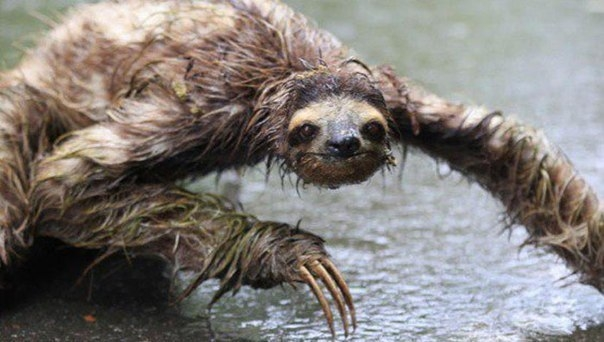 Бурогорлый ленивец промок, но вроде не унывает. Скорость ленивца на земле — всего два метра в минуту.