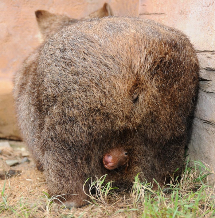Детёныш вомбата смотрит на вас прямо из...сумки! Да, у вомбатов она в обратную сторону.