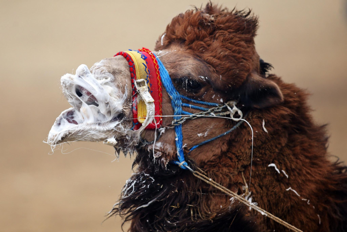 Верблюда сильно разозлили, и он решил всех обплевать (вероятно рядом самка, и он на взводе).